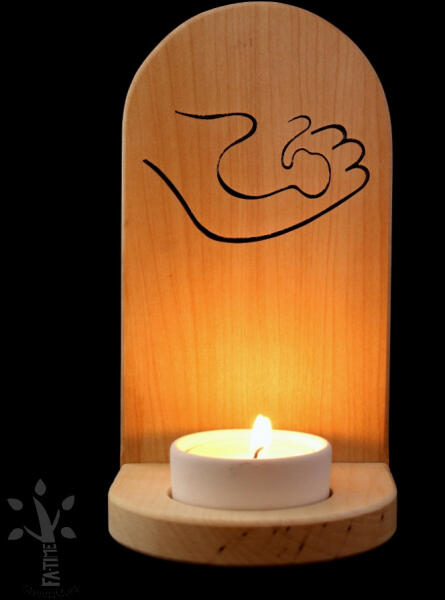 Simon András grafikusművész egyvonalas rajzával díszített mécsestartó. Lombfűrészeléssel készült. Asztali-fali kivitel. Kedves családi ajándék lehet ez a kis mécsestartó keresztelőre, gyermekszületésre, vagy csak úgy. A mécsesre egyedi gravírozás kérhető! Figyelem! A gravírozás maximális mérete 70x20 mm. (Az ár a grafikus jogdíját is tartalmazza!) www. fajandekok.