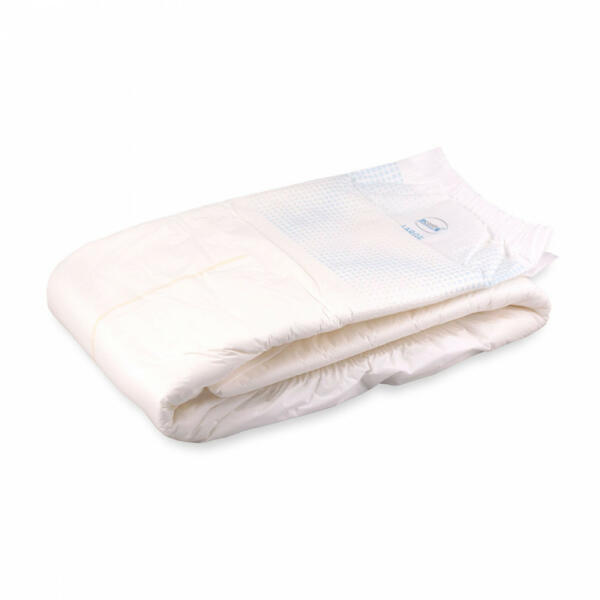 Fehér színű, fóliás külső borítású, M méretű felnőtt pelenka. Nedvszívó kapacitás 5200ml Derékbőség 76cm - 102cm Magas szivárgás védelem Megerősített elülső rész Négy tépőzáras szalag Szagvédelem Latex mentes Nedvesség jelző Rugalmas derékpántok elöl és hátul