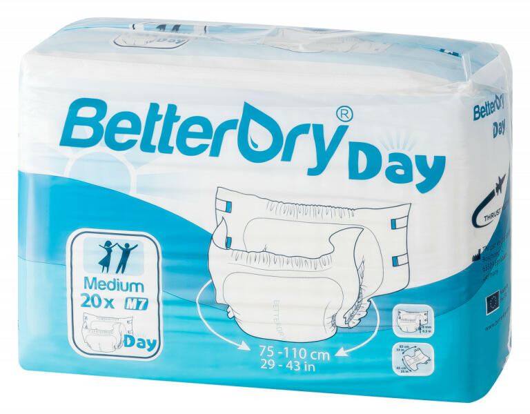 Fehér színű, fóliás külső borítású, M méretű felnőtt pelenka. Nedvszívó képesség ISO 11948-1 szerint: 2500ml Derékbőség 75cm - 110cm Magas szivárgás védelem Szagvédelem Latex mentes Nedvesség jelző Rugalmas derékpántok elöl és hátul Négy ragasztószalag