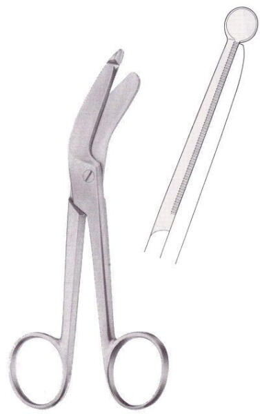 Rozsdamentes acélból, Sterilizálható 14 cm-es olló kötszer eltávolítására. Kiképzése védi a beteget a sérüléstől.
