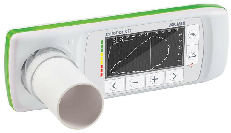 A MIR Spirobank II Basic egy szűrő spirométer, amely ideális orvosok számára. A MIR Spirobank II Basic egy szűrő spirométer, amely ideális orvosok számára. Szűrő spirométer orvosok számára A stoplight rendszer megkönnyíti a teszt kiértékelését Alkalmas a dohányzásról való leszokáshoz (a tüdő korának becslése) Akkumulátorral működik (kb. 40 óra üzemidő teljes f