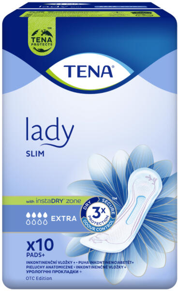 Az instaDRY zóna azonnal felszívja, a szuperabszorbens mag pedig mélyen a betét belsejébe zárja a folyadékot, így az nem érintkezik a bőrrel. A szivárgás, a kellemetlen szagok és a nedvesség ellen hármas védelmet biztosító TENA Lady Slim Extra a tökéletes napi használatú termék középsúlyos vizelettartási problémával élő nőknek. A puha inkontinenciabetét kényelmes