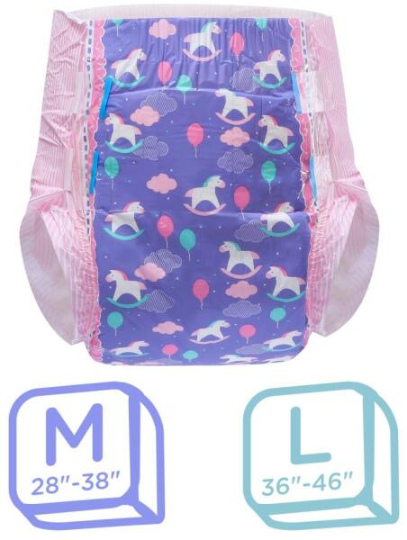 Színes, mintás, fóliás külső borítású, M méretű felnőtt pelenka. Nedvszívó kapacitás több, mint 5131ml Derékbőség 71cm - 96cm Magas szivárgás védelem Megerősített elülső rész Gyors felszívódást biztosító mag Négy ragasztószalag