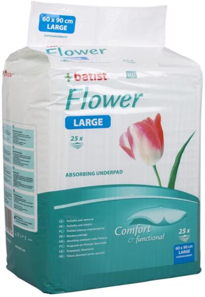 Nedvszívó alsó párna Flower őrölt cellulóz maggal, nedvszívó polimer hozzáadásával és puha, bőrbarát nem szőtt felület, egyik oldalán vízhatlan fóliával borítva. Ők négy méretben gyártják. A megadott darabszám PE tasakban van csomagolva. Az orvosi alátétek olyanok inkontinens ágyhoz kötött betegek kezelésére és más hasonló célokra használják egészségügyi