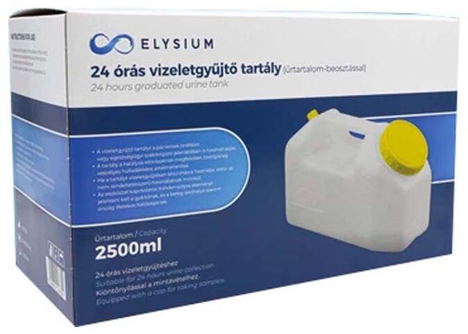 Elysium vizeletgyűjtő tartály 24 órás vizeletgyűjtéshez űrtartalom beosztással és kiöntőnyílással. A speciális vizsgálatokhoz szükséges nagyobb mennyiségű vizelet biztonságos tárolására, valamint szállítására kiválóan alkalmas vizeletgyűjtő edény.
