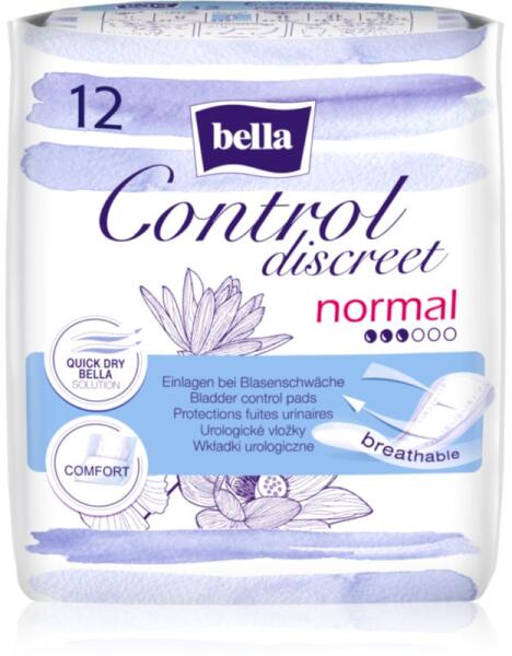BELLA Control Discreet Normal, 12 db, Gyógyászati segédeszközök nőknek, Ne rettegjen a mindennapi tevékenységektől vagy a nem várt tüsszentéstől, esetleg köhintéstől. A BELLA Control Discreet Normal inkontinencia betétek megbízható védelmet nyújtanak és biztonságérzetet adnak a vizeletvisszatartás zavaraiban szenvedőknek. Tulajdonságok: kényelmes és selymes anyag magas