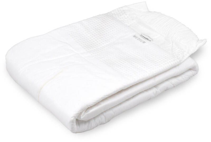 Fehér színű, fóliás külső borítású, L méretű felnőtt pelenka. Nedvszívó kapacitás 7500ml Derékbőség 84cm - 107cm Magas szivárgás védelem Megerősített elülső rész Négy ragasztószalag Szagvédelem Latex mentes Rugalmas derékpántok elöl és hátul