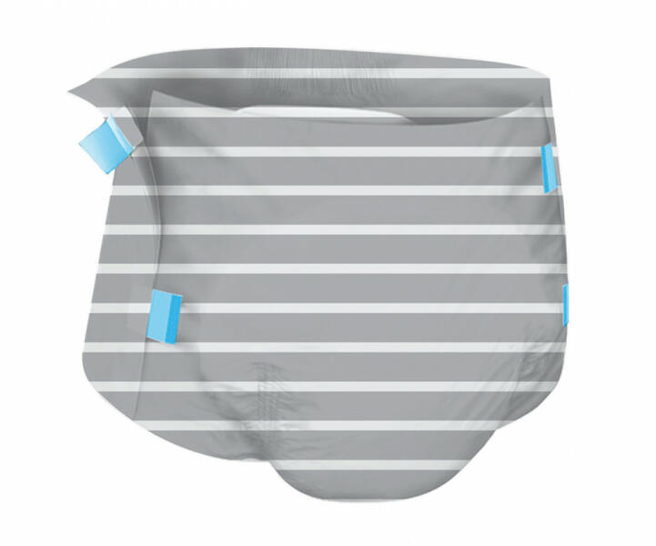 Világos szürke színű, csíkos mintás, fóliás külső borítású, L méretű felnőtt pelenka. Nedvszívó képesség 5100ml Derékbőség 100cm - 150cm Szagvédelem Latex mentes Gyors felszívódást biztosító mag Rugalmas derékpántok elöl és hátul 4 db újraragasztható ragasztócsík