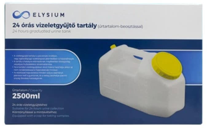 Elysium vizeletgyűjtő tartály 24 órás vizeletgyűjtéshez űrtartalom beosztással és kiöntőnyílással. A speciális vizsgálatokhoz szükséges nagyobb mennyiségű vizelet biztonságos tárolására, valamint szállítására kiválóan alkalmas vizeletgyűjtő edény.