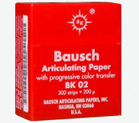 A Bausch 200 artikulációs papír a nyomáseloszlást eltérőárnyalatokkal jeleníti meg, erősebb harapás-sötétebb, gyengébbharapás-halványabb árnyalat. Az okklúziós pontok azonnal láthatóvá válnak, így anyomáseloszlás optimalizálható.