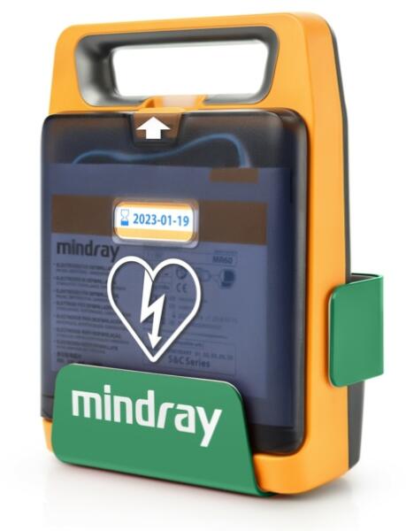 A Beneheart C defibrillátorok számára szolgáló praktikus falitartó, zöld színben.