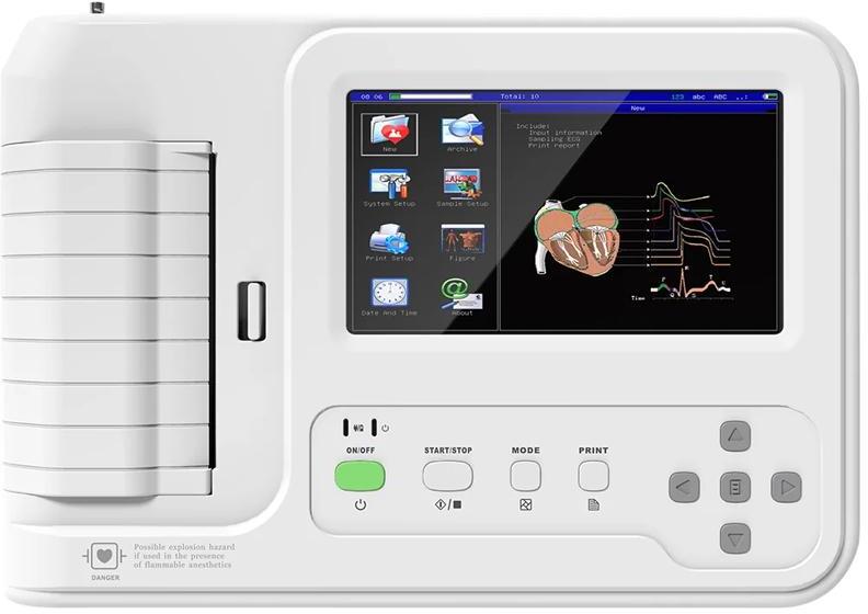 Contec CMS 600G 6 csatornás EKG készülék A Contec CMS 600G 6 csatornás EKG készülék 12 elvezetéses EKG, mely hőnyomtató rendszerrel nyomtat. AUTO/Kézi módban, automatikusan mér és diagnosztizál . Időnyomtatás igény szerint beállítható: 1/2/3/5/10/20/30/60 percenként. AC/DC használati lehetőség. Automatikusan kikapcsol, ha a megadott időn belül nem történik művelet. T