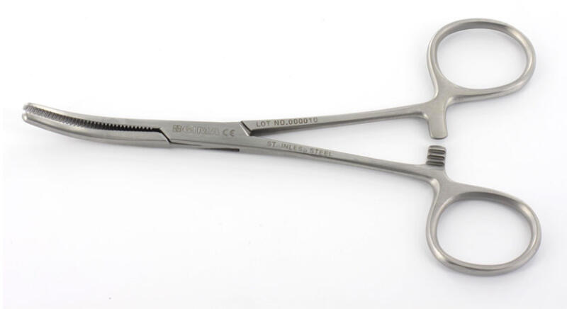 Hajlított, rozsdamentes acél, 18 cm-es érfogó csipesz. 18 cm hossz hajlított kivitel rozsdamentes acél