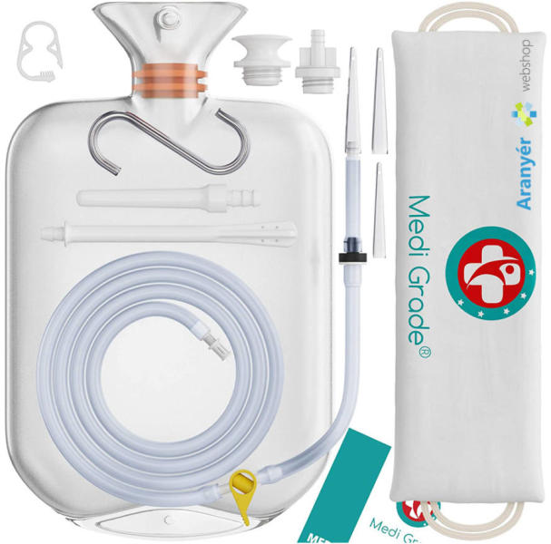 Beöntés elvégzésére használható készlet, szilikon tartállyal. Az eszköz megfelel minden EU-s egészségügyi előírásnak, PBA és ftalát mentes szilikonból készül. Bármilyen gyógyanyaggal, gyógyszerrel használható, tökéletesen alkalmas gyógynövényes, kávés, probiotikus, sóoldatos vagy bármilyen más típusú beöntés elvégzéséhez. Az edény: 2 literes szilikon bal