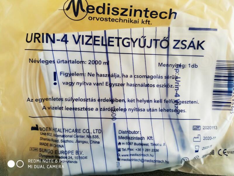 Mediszintech URIN 4 vizeletgyűjtő zacskó, 2 l testen viselhető steril, egyszerhasználatos vizeletgyűjtő gyógyászati segédeszköz. Indikáció: Vizeletürítés akadályozottsága, neuromuscularis hólyagdiszfunkció, gerincvelősérülés okozta hólyagdiszfunkció, hólyagnyakszűkület, hólyag rosszindulatú daganatai, hólyag jóindulatú daganatai, húgycsőszűkület, húgycső ros