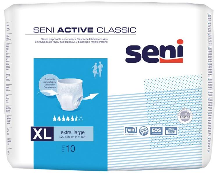 Seni Active Classic Extra Large nadrágpelenka, 10 darabos A Seni Active Classic nadrágpelenka az enyhe vagy középsúlyos inkontinencia mellett aktív életvitelt folytatók számára ajánlott, illetve rehabilitáció időszakára. A Seni Active Classic egyszerhasználatos nadrágok a hagyományos alsóneműhöz hasonlóan húzhatók fel és akként is viselhetők. Jellemzők: - ideálisan iga