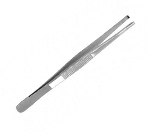 14 cm hosszú 1x2 horog végenként sebészeti beavatkozásnál a szövetek, bőrszélek megfogására, rögzítésére szolgál, külső rovátkolt felülete, megakadályozza a kéz megcsúszását rozsdamentes acélból, sterilizálható.