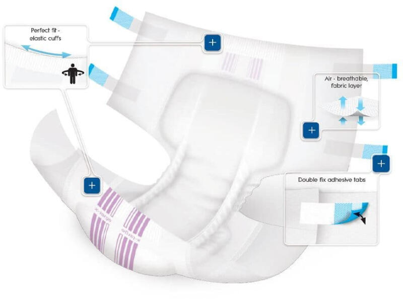 Színes, mintás, fóliás külső borítású, M méretű felnőtt pelenka. Nedvszívó kapacitás 5500ml Derékbőség 79cm - 92cm Magas szivárgás védelem Megerősített elülső rész Gyors felszívódást biztosító mag Négy ragasztószalag Nedvesség esetén elhalványul Rugalmas derékpántok elöl és hátul