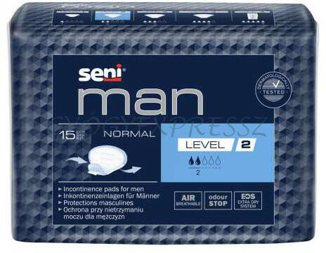Seni Man Normal urológiai betét 300 ml. A Seni Man urológiai betét a könnyű és közepesen súlyos incontinentia zavarokkal küzdő személyek számára javasolt. Megelőzi a szivárgásokat, valamint elnyeli a nedvességet és a szagokat, ezzel biztonság- és szárazságérzetet biztosít. A légáteresztő Seni Man urológiai betét az aktív életmódot követő, a diszkrécióval páros