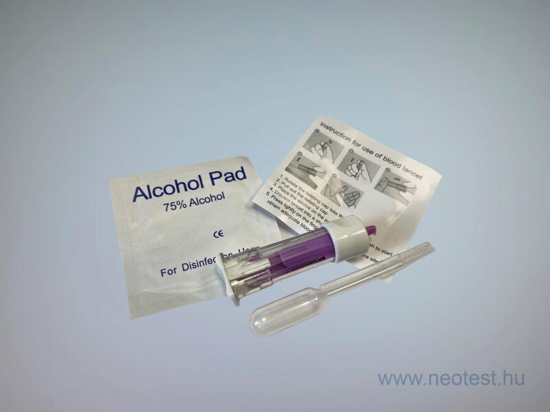 Ujjbegyszúró készlet önellenőrző vizsgálathoz A szett tartalma: 1 db automata ujjbegyszúró lándzsa, 1 db műanyag pipetta, 1 db alkoholos fertőtlenítő törlőkendő és 1 db használati útmutató ábrákkal. Minimálisan rendelhető mennyiség: 5 db