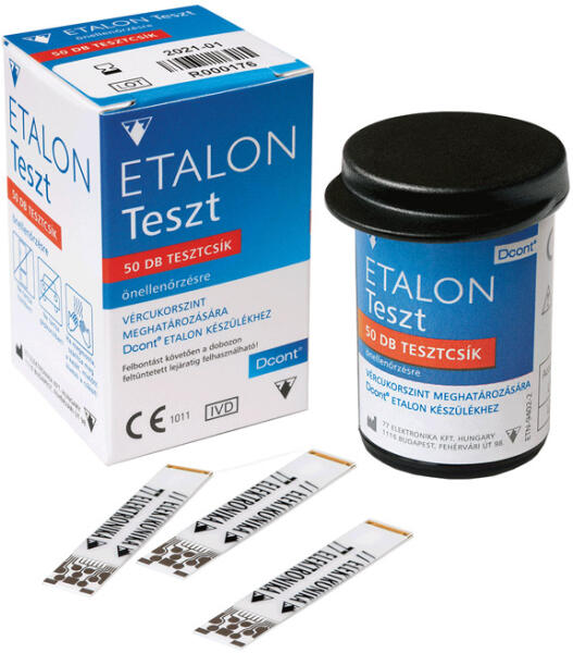 Az Etalon teszt a DCont® Etalon és a DCont® Novum vércukormérő készülékekkel kompatibilis vércukor önellenőrzésére szolgáló tesztcsík. A méréshez csupán 0,6 l vérmennyiségre van szükség, melyet a tesztcsík a teljes szélességében felszív.