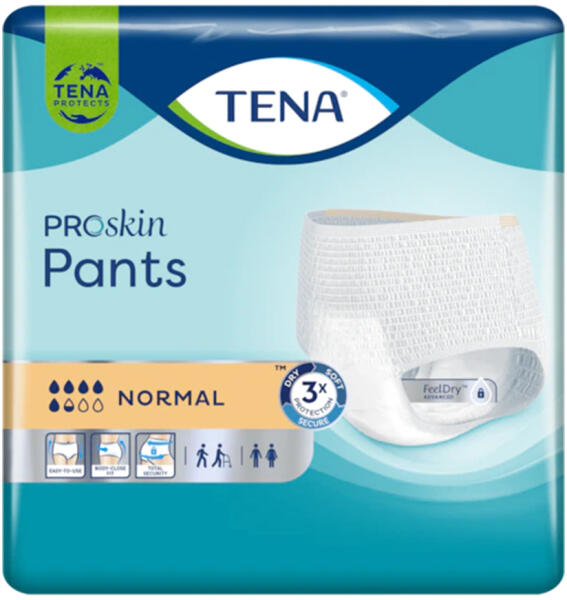 A TENA Pants Normal pelenkanadrág puha és kényelmes inkontinencia-nadrágpelenka nőknek és férfiaknak, nappali és éjszakai használatra is. Más hagyományos felnőtt pelenkanadrágoktól eltérően a TENA ProSkin Pants pelenkanadrág nedvességcsökkentő technológiával rendelkezik a száraz érzés, a szivárgás elleni védelem és a szagsemlegesítés érdekében. A FeelDry Advanced