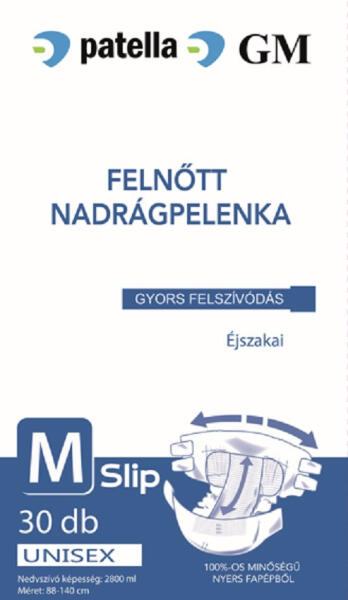 A GM felnőtt pelenkák úgy lettek tervezve, hogy hatékonyan felszívják a nedvességet, és megtartsák azt, ezzel megakadályozva a nedvesség szivárgását. Használata alkalmas lehet közepes vagy súlyos inkontinencia esetén, fogyatékkal élő, vagy ágyhoz kötött betegek számára, mozgáskorlátozottság, súlyos hasmenés, illetve demencia esetén. Termékjellemzők: A légáteresz