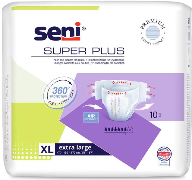 Seni Super Plus hagyományos légáteresztő nadrágpelenka megnövelt nedvszívó kapacitással tökéletes és megbízható védelem az aktív életet élők és a csökkent mozgásképességűek számára egyaránt. Középsúlyos és súlyos inkontinencia esetére ajánlott. Tulajdonságok: dupla rögzítés – komfort és biztonság: – kétoldali elasztikus derékgumírozás- dupla tépőz