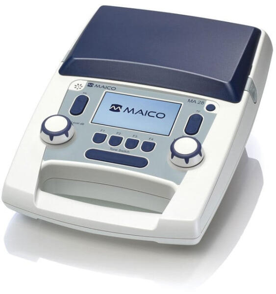 A Maico MA 28 szűrő audiométere egy olyan audiométer, amely a páciens hallóképességét légvezetésen (AC) vagy csontvezetésen (BC) keresztül méri. Tartozékai a beépített tárolórekeszben tárolhatók, fogantyúja pedig egyszerű szállítást tesz lehetővé. Ennek eredményeképpen az MA 28 mobil használatra is alkalmas. A nagyméretű színes LED-kijelző és az intuitív kezel