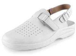 Női fehér munkacipő tépőzáras csattal és szíjjal a talp körül.