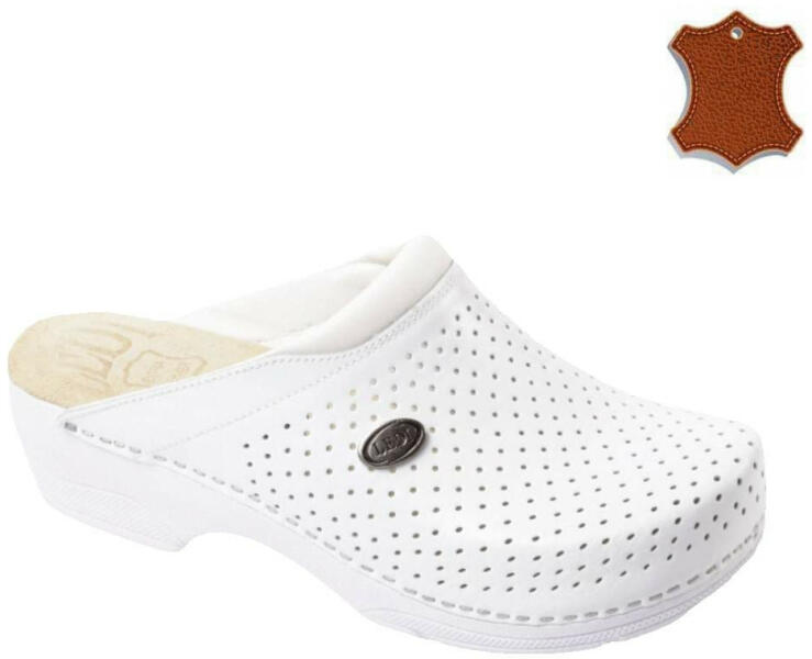 Női bőr klumpa, műanyag talppal. A felsőrész bemeneti nyílásánál, szivacsos szegő található, a komfortosabb érzetért. A talpbetét puha, szivacsos bőr. A természetes anyagnak és a felsőrész lyukacsosságának köszönhetően, jól szellőzik. Ajánlott: mindennapos utcai használatra, otthonra vagy munkahelyre ( több órás, szaladgálós munka alatt sem fárad el a láb ). Mé