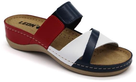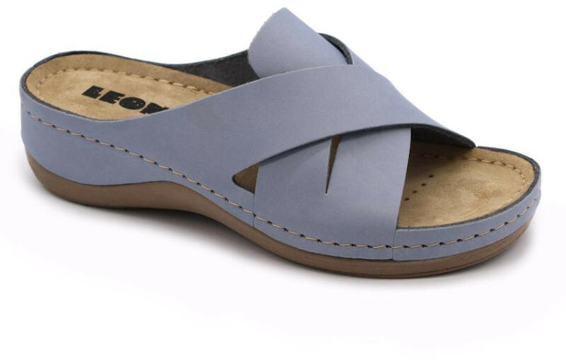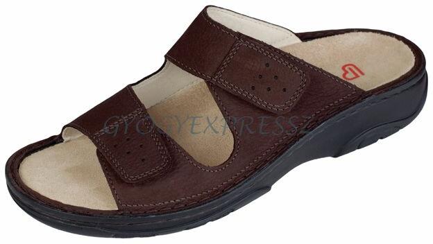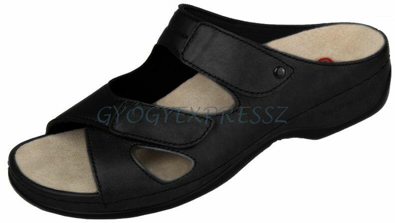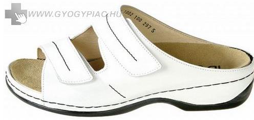 Női nyitott, divatos megjelenésű, bőr papucs. A felsőrész tépőzárral szabályozható. A talp anatómiai kialakítású parafa, puha velúrbőr talpbetéttel és habszivacs alsó résszel. Ajánlott minden napos otthoni vagy utcai használatra, könnyű nyári sétára ( több órás gyaloglás után sem fárad el a láb ). Felsőrész anyaga: valódi bőr felső Belsőrész anyaga: bőr b
