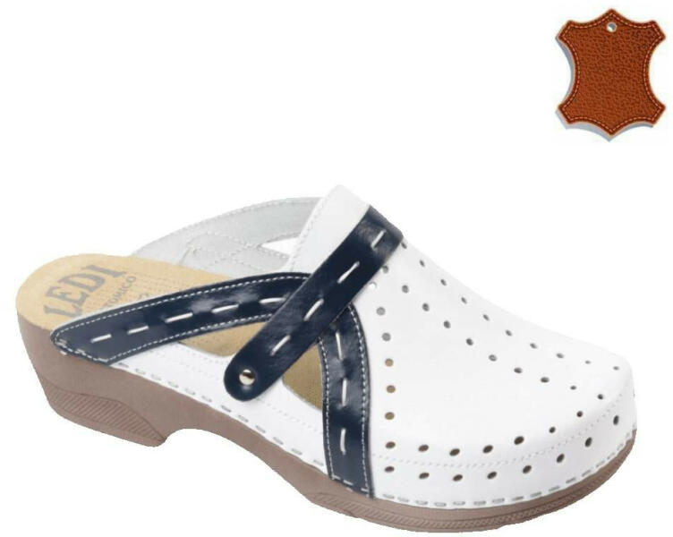Berkemann Daria fehér papucs Szín:FEHÉR Felső: BORJÚBŐR Belső: BŐR Talp: 35 mm sarok, 22 mm emelkedés Modell: NŐI Bőr felsőrész kiváló minőségű olasz bőrből, kivehető, mosható, cserélhető bőr talpbetét. Csúszásmentes talp. Bőség tépőzárral állítható. Normál és széles lábfejre ideális, munkába és otthonra egyaránt használható. .
