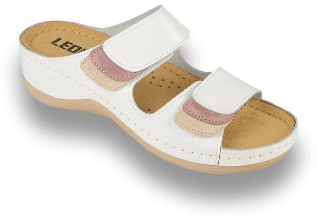 Női nyitott, bőr papucs. Mind a két szíj tépőzárral szabályozható . A talp anatómiai kialakítású parafa, puha velúrbőr talpbetéttel és csúszásmentes habszivacs alsó résszel. Ajánlott minden napos otthoni vagy utcai használatra, könnyű nyári sétára ( több órás gyaloglás után sem fárad el a láb ). Méretcm3623,537243824, 539254025,54126 .