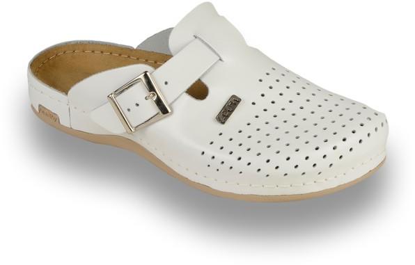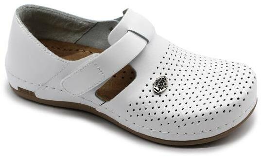 Női bőr cipő, a talpán műanyag csúszásgátló betéttel. A könnyebb felhúzást és a kényelmes bőséget tépőzár biztosítja. A talpbetét puha zselés, bőr. A természetes anyagnak és a lyukacsos felsőrésznek köszönhetően , jól szellőzik. Munkavégzéshez ajánljuk egészségügyben, konyhán, szociális intézményekben, stb. dolgozó hölgyek részére ( több órás, megf