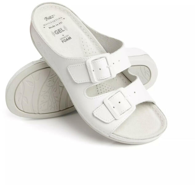 Batz FC02 női papucs fehérben. Tradicionális, több mint 10 éve gyártott, folyamatosan fejlesztett 100% valódi bőr papucs. Anatómiai kialakítású talpszerkezete maximális kényelmet biztosít a lábnak. 2 db állítható, csatos pántjának köszönhetően bősége széles tartományban állítható, szinte bármilyen lábfejre kiválóan idomul. 100% valódi bőr 2 db állítható csat