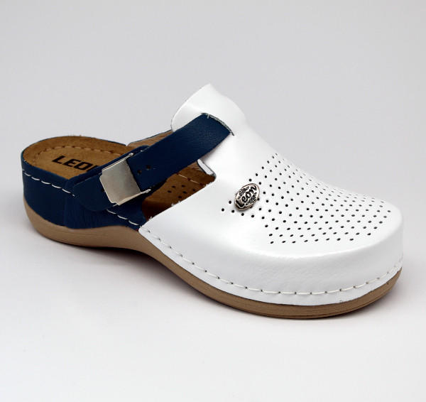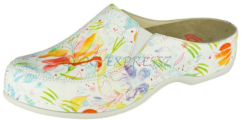 Női bőr klumpa, műanyag csúszásgátlós talppal. Oldalt fém csat található, amellyel szabályozni lehet a bőséget. A talpbetét puha zselés, bőr. A természetes anyagnak és a felsőrész lyukacsosságának köszönhetően , jól szellőzik. Ajánlott: mindennapos utcai használatra, otthonra vagy munkahelyre ( több órás, szaladgálós munka alatt sem fárad el a láb ). Méretcm362