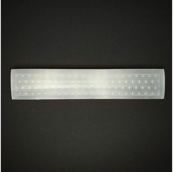 Szelenit lap életvirág gravírozott 4x20cm Leírás: A szelenit lap életvirág gravírozott 4x20cm egy kivételes minőségű ásványi tárgy, amely nemcsak spirituális gyakorlatokhoz, hanem otthoni dekorációként is tökéletes választás. A természetes szelenit ásvány harmonikus energiát sugároz, amely hozzájárul a belső nyugalom megteremtéséhez és az otthoni tér esztétikus