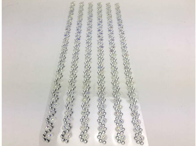 Öntapadós strasszfüzérCsíkok mérete: 0,9 cm x 26,5 cmKiszerelés: 6 csík/csomagSzín: ezüstAnyaga: öntapadós műanyag Öntapadós strasszfüzér ezüst