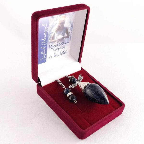 Jophiel Arkangyal csodás kék goldstone ásvány ingája, bársony díszdobozban, angyalszárnyakkal díszítve. Kreativitás, szépség és lendület. Tudtad, hogy ásvány ingáink nagy részét mi magunk tervezzük és készítjük ? Ennek a kék goldstone ásvány ingának a súlya kb. 16-18 gramm, az inga goldstone csepp alakú ásvány, díszített ásvány végzárral. Csodás kék, fémes