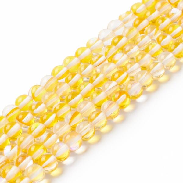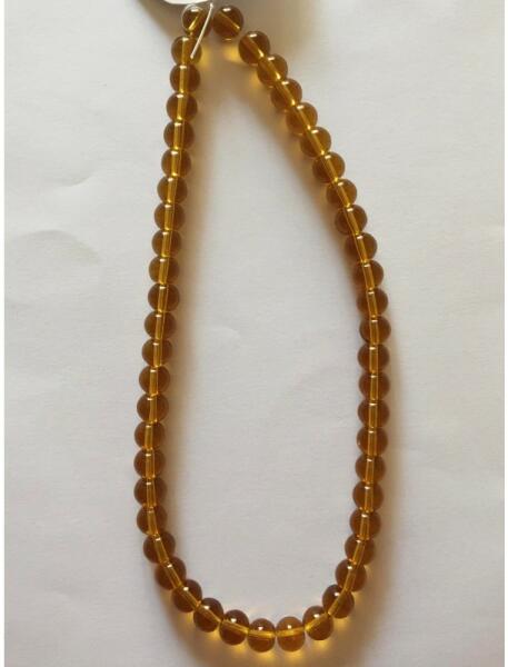 Természetes ásványokból készített (csiszolt) kerek alakú, fúrt Topáz ásványgyöngyök. A gyöngyök mérete 8 mm. Egy lánc kb. 37 cm hosszú, és kb. 48 db ásványból áll.