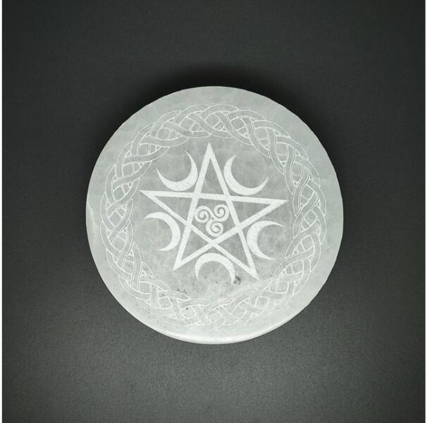 Szelenit korong kelta pentagram 14cm Leírás: A szelenit korong kelta pentagram 14cm egy kivételes minőségű ásványi tárgy, amely nemcsak spirituális gyakorlatokhoz, hanem otthoni dekorációként is tökéletes választás. A természetes szelenit ásvány harmonikus energiát sugároz, amely hozzájárul a belső nyugalom megteremtéséhez és az otthoni tér esztétikus megjelenéséhez
