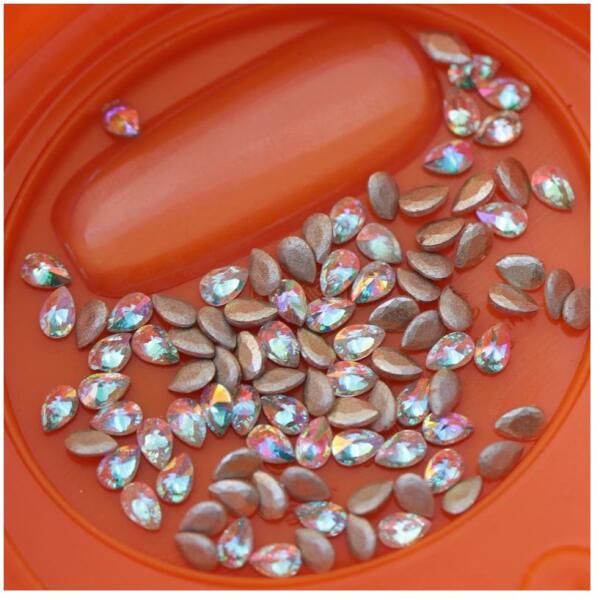 Mini cirkónia kristály formakő Crystal AB színben, csepp formában. Majdnem teljesen lapos aljuk könnyen beépíthetővé teszi felhasználásukat, fényerejük sokkal szikrázóbb az általános strasszkövek csillogásánál.