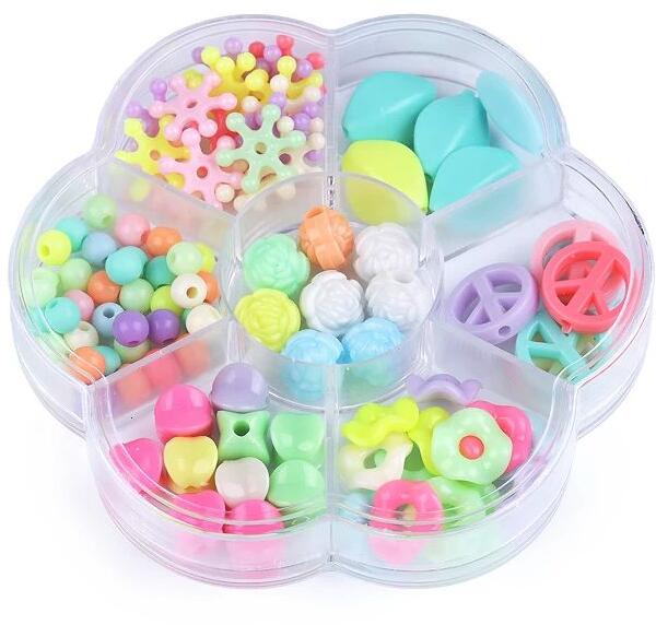 Színes műanyag gyöngyök készletben. A készlet 7 különféle négyszögletes gyöngyöt tartalmaz, 5-10mm-es méretben. A gyöngyök virág alakú dobozban vannak. Műanyag gyöngy készlet, praktikus dobozban. Alkalmas ékszerek és díszek készítésére. A készletben 7 különböző méretű és színű műanyag gyöngy található, amelyek átmérője 4-12 mm között változik. A gyö
