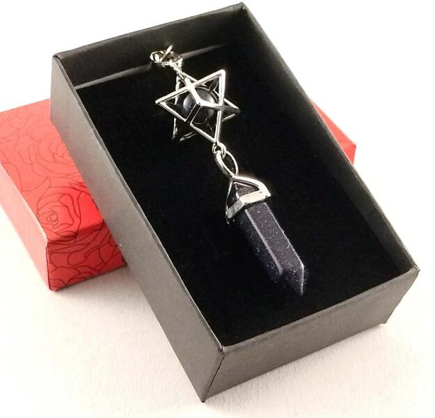 Nagyon könnyen használható goldstone inga, merkaba csillaggal és goldstone gömbbel díszítve, melynek súlya mindössze kb. 10 gramm. Színe mélykék, enyhe fémes csillogással, csodás darab, díszdobozban szállítjuk Neked! Az ingát kellemes fogású, ezüst színű fém gömb díszíti , kezdőknek is kiváló választás. Az ásvány inga lánca kb. 20 cm hosszú, nagyon látványos
