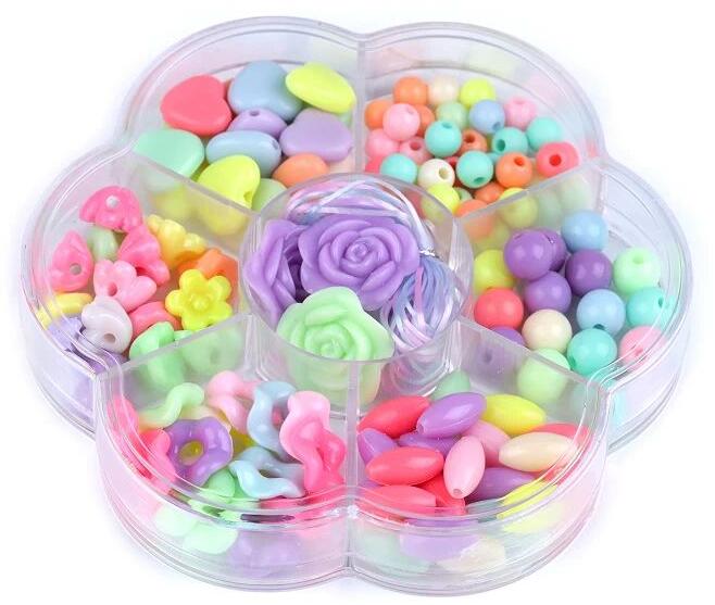 Színes műanyag gyöngyök készletben. A készlet 7 különféle négyszögletes gyöngyöt tartalmaz, 5-10mm-es méretben. A gyöngyök virág alakú dobozban vannak. Műanyag gyöngy készlet, rugalmas damillal, praktikus dobozban. Alkalmas ékszerek és díszek készítésére. A készletben 7 különböző méretű és színű műanyag gyöngy található, amelyek átmérője 4-12 mm közöt