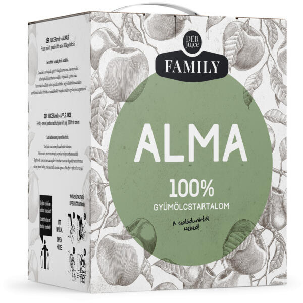 Dér juice family almalé 100% 3000 ml Hosszantartó préselési eljárással készül. Rostos Natúr 0% hozzáadott cukor, aroma és tartósítószer Összetevők: alma, étkezési sav:citromsav 3 literes kiszerelés, BIB csomagolás. Felbontás után 3 hétig megőrzi a szavatosságát Üveges kiszerelés Felelős kertművelésből származik