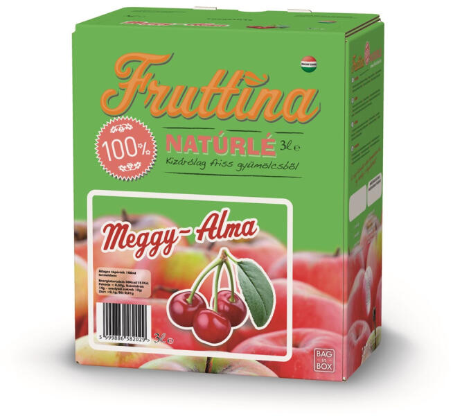 Fruttina alma-meggy gyümölcslé 3000 ml "Átlagos tápérték 100ml termékben: Energiatartalom 36Kcal/151KJ; Fehérje
