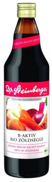 Dr. steinberger bio b-aktív zöldséglé 750 ml A híres osztrák természetgyógyász Rudolf Breuss receptje szerint készült tejsavas erjesztésű 100%-os zöldséglé céklából, sárgarépából, zellerből, burgonyából és retekből. Ideális az egészséges táplálkozás kiegészítésére. Alacsony kalóriaértékű, ezért cukorbetegek étrendjébe is jól beilleszthető.