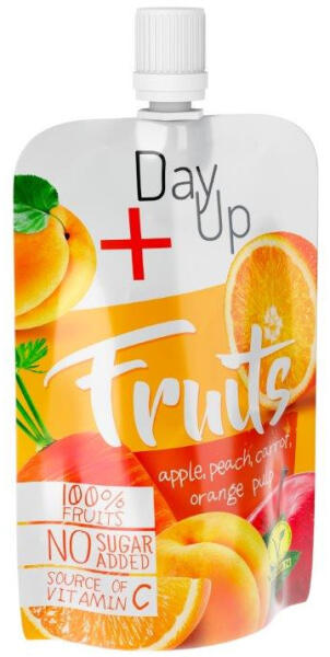 Day Up fruits almapüré barackkal, sárgarépával, narancsdarabokkal és c-vitaminnal 100 g DayUp Fruits gyümölcspüré almával, barackkal, répával és narancspéppel, hozzáadott C-vitaminnal. Hozzáadott glutén-, cukor- és tartósítószermentes. Vegán. Összetevők: almapüré 67,4%, barack 16%, répa 10%, narancshús 6,5%, C-vitamin Tárolás szobahőmérsékleten. Felbontás után a